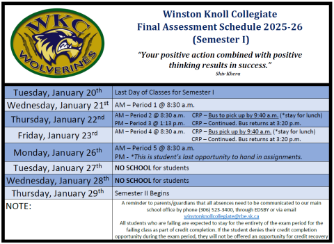 Please email winstonknollcollegiate@rbe.sk.ca, report via EDSBY or call the Winston Knoll Collegiate Main School Office (306) 523-3400 to report your child's attendance during Final Assessment week.